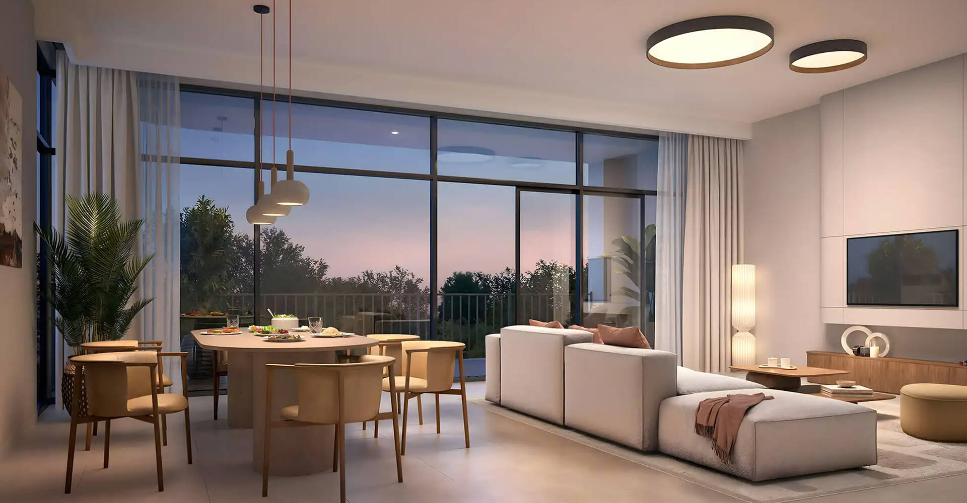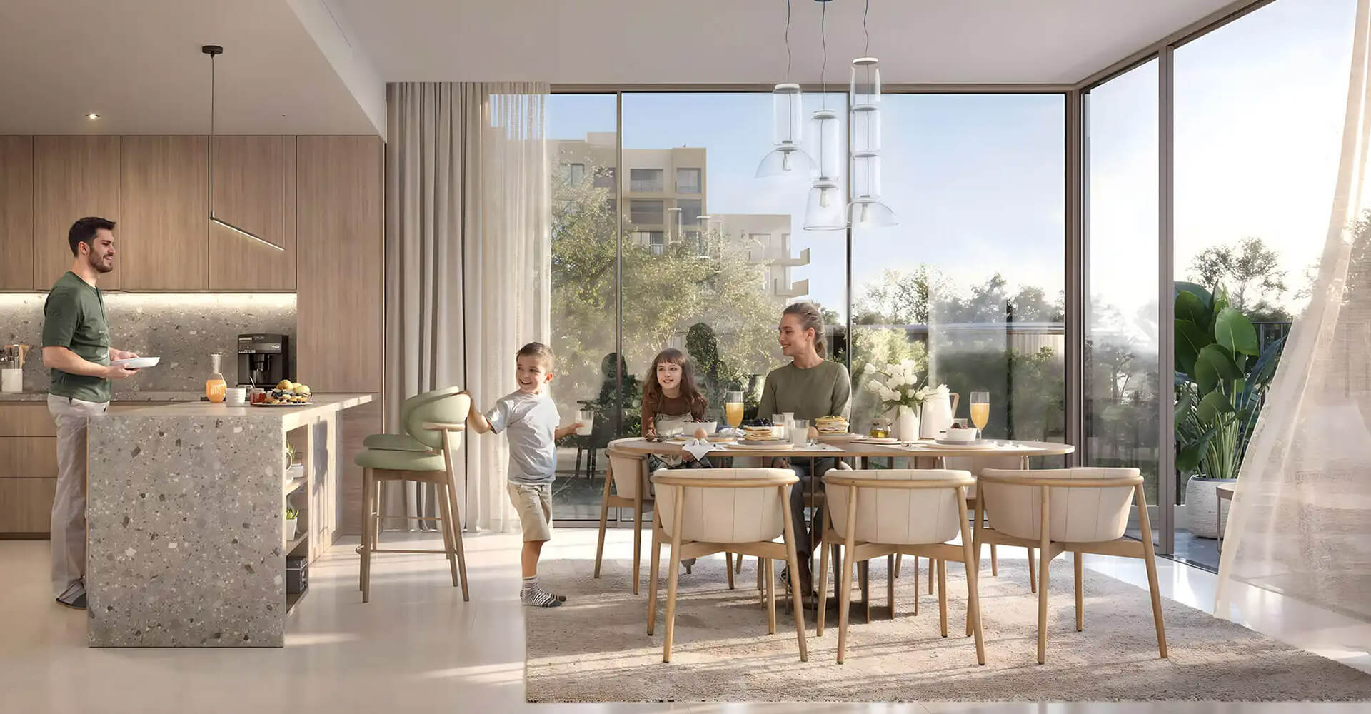 The interiors of Capria at Ghaf Woods come in two design options — Radiance and Twilight, with natural tones and premium materials. Panoramic windows flood the space with light and offer views of greenery, creating a welcoming ambience. The kitchens are equipped with integrated appliances including a dishwasher, stove, oven, hood and refrigerator, providing functionality and contemporary style.