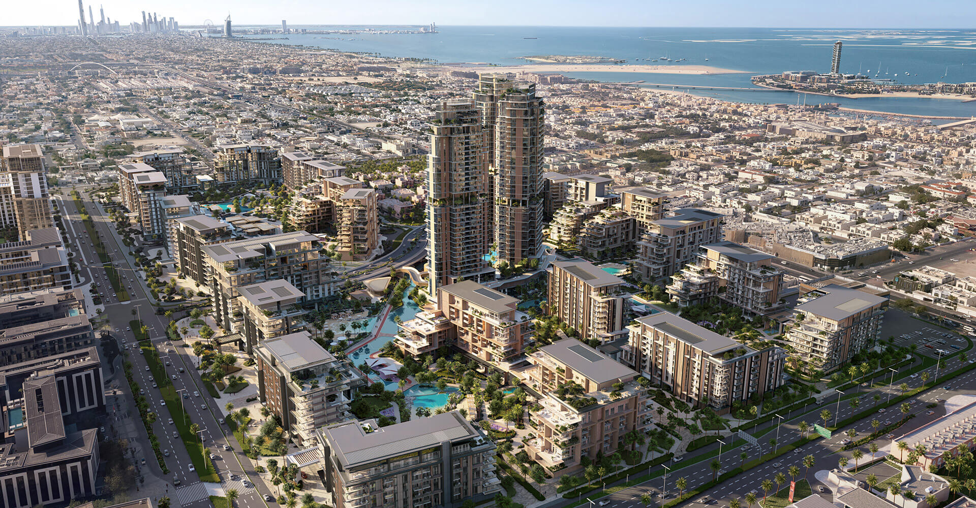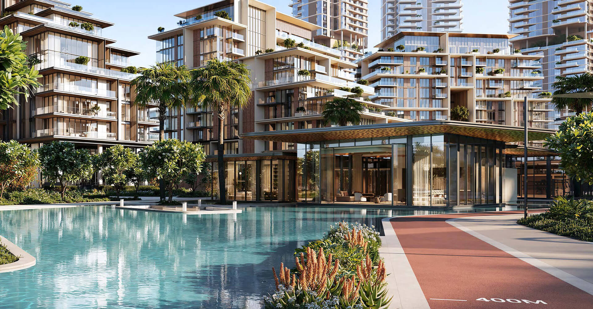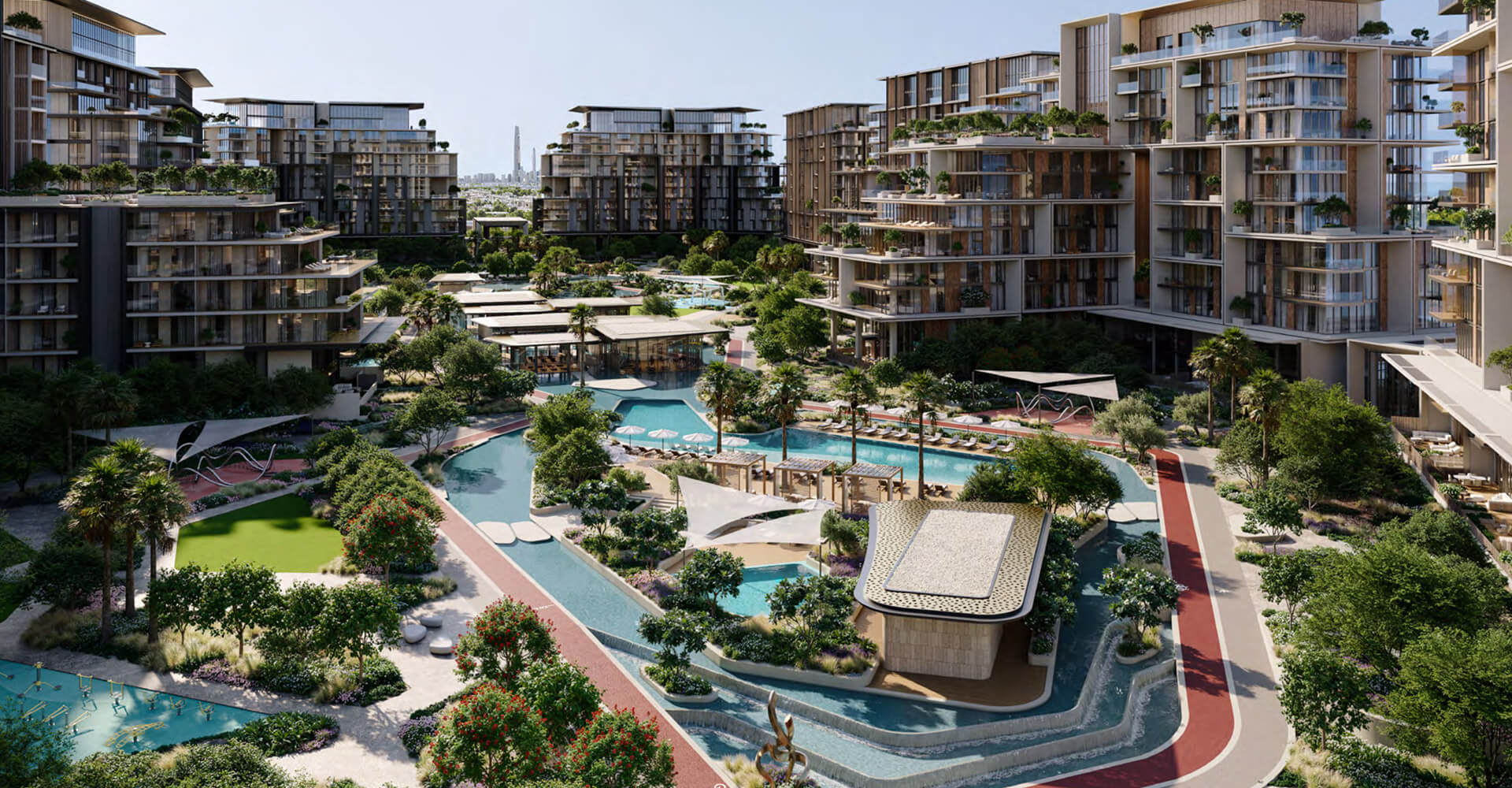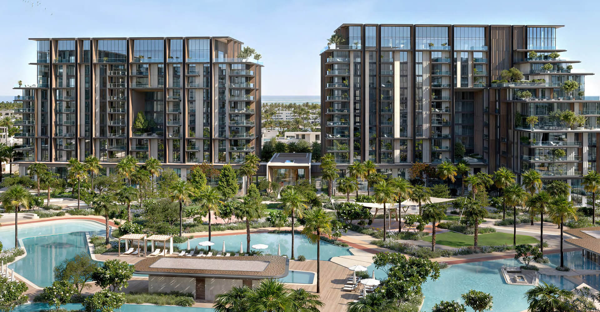 The mid-rise towers hold dual characteristics that combines utility with eye-catching design elements alongside outdoor terraces that offer unobstructed water views to the park below. Beyond being a residential address this space becomes an environment for flourishing growth. The interior spaces use precise attention to details to re-create luxury. These residences demonstrate luxury through their smooth premium materials in kitchens and their spacious bedrooms with room-sized closets. Signature apartments provide double-height rooms that reflect outside light as they deliver uninterrupted water and city views. Four-bedroom duplex units include reserved exterior terraces and direct entrance to the park which gives residents unmatched refined living experiences.
