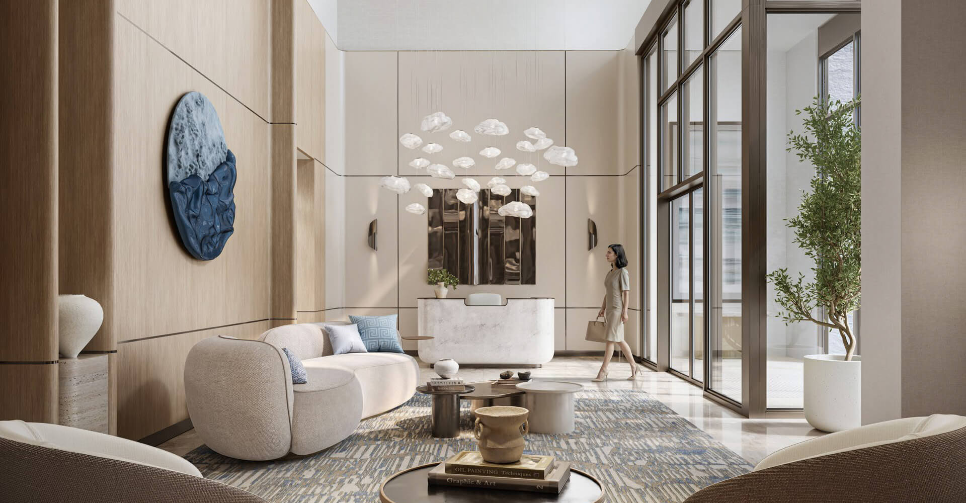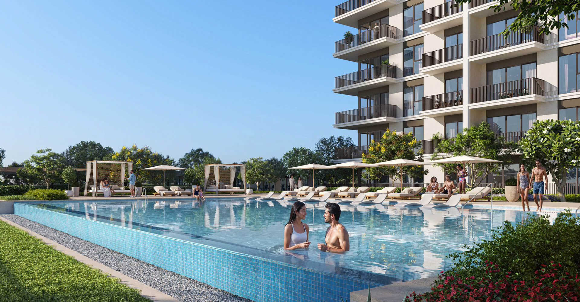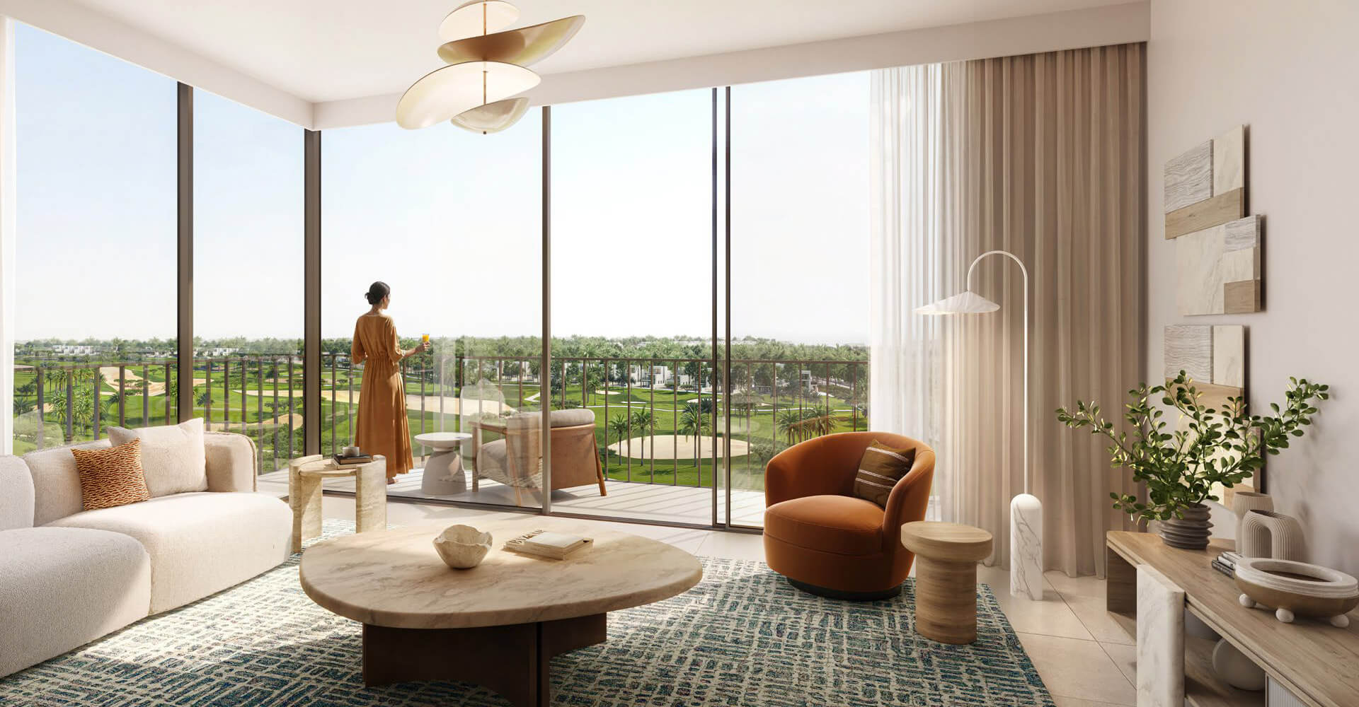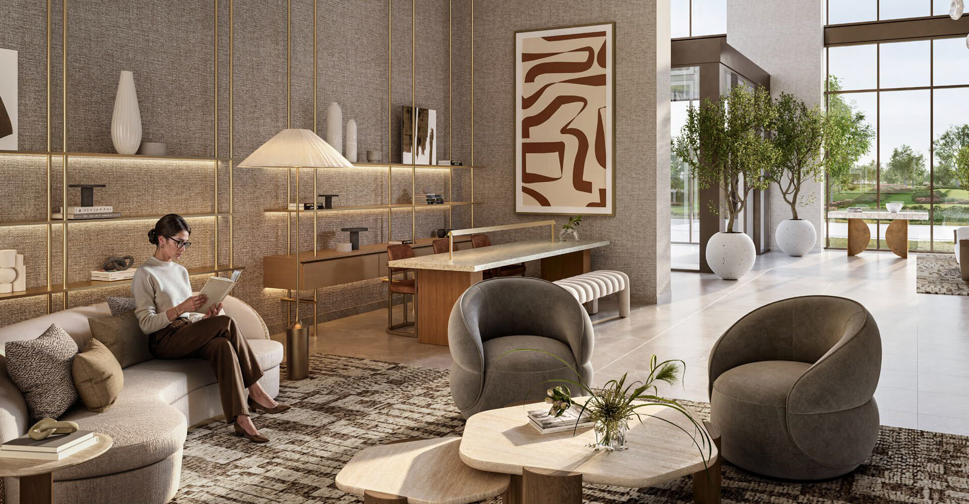 The Grove Ridge by Emaar Properties is located next to a golf course, surrounded by green lawns and gardens. The architecture of this property in Dubai is modern: low-rise, panoramic windows, balconies overlooking the golf course and a light-colored facade. The interior public spaces feature bright lobbies with panoramic glazing, comfortable waiting areas and beautiful decorative elements.