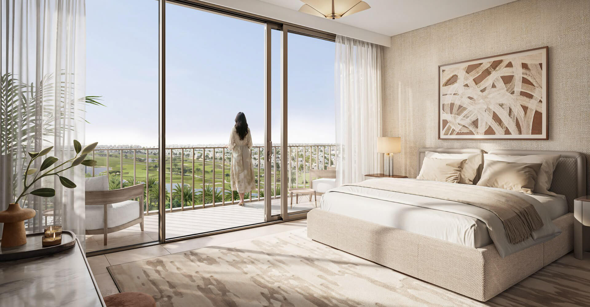 The layouts of these properties in Dubai are designed in a modern open format. The living room, dining area and kitchen are combined into a single space that can be easily divided with furniture. The kitchen becomes the centre of the apartment: it is a bright room with an island or bar counter, sleek wood-effect cabinets, quartz worktops and well-designed storage space. The interiors of the apartments at Grove Ridge at Emaar South are decorated in light colours with an emphasis on natural materials — wood, stone and soft textures. The bedrooms have large windows and built-in wardrobes, and the master bedrooms have en-suite bathrooms. The townhouses at Grove Ridge by Emaar Properties also have storage rooms and laundry rooms.