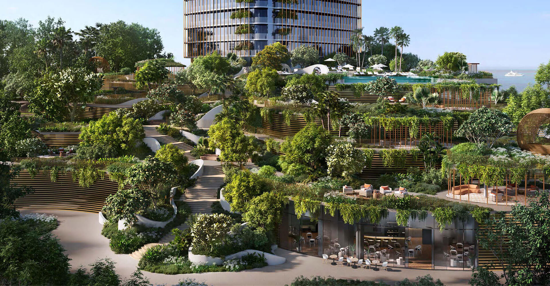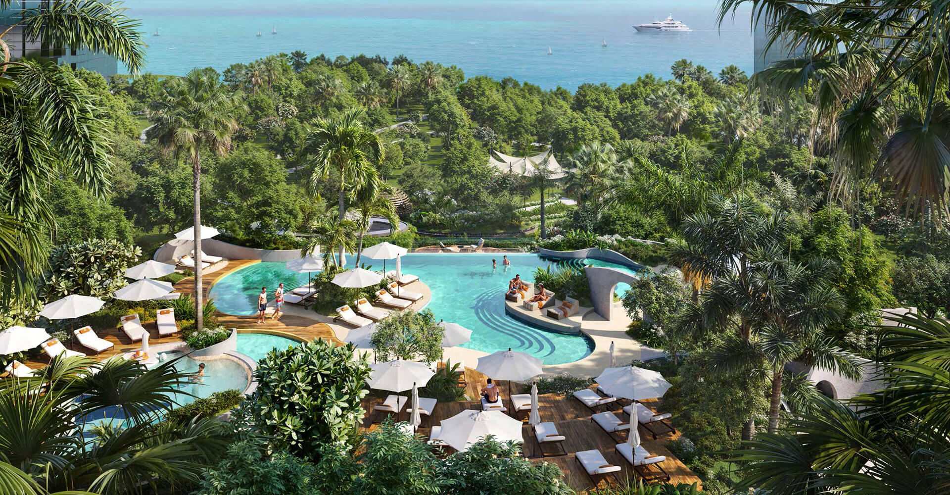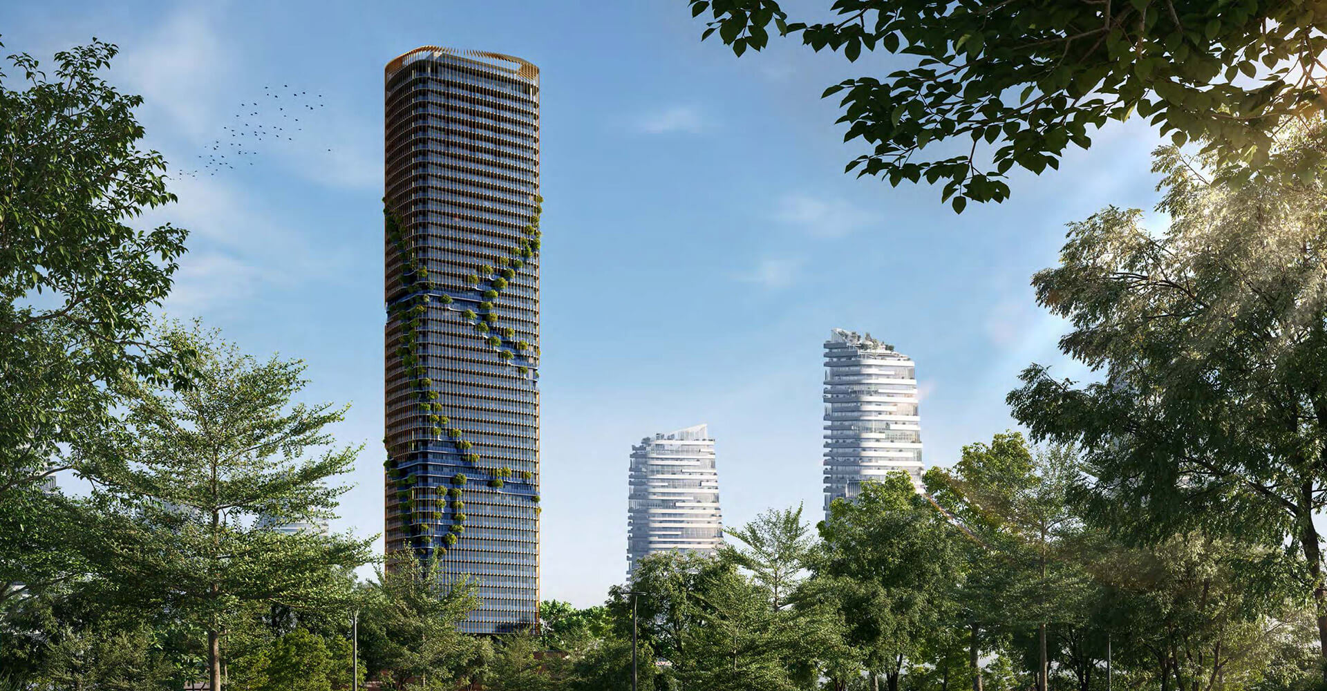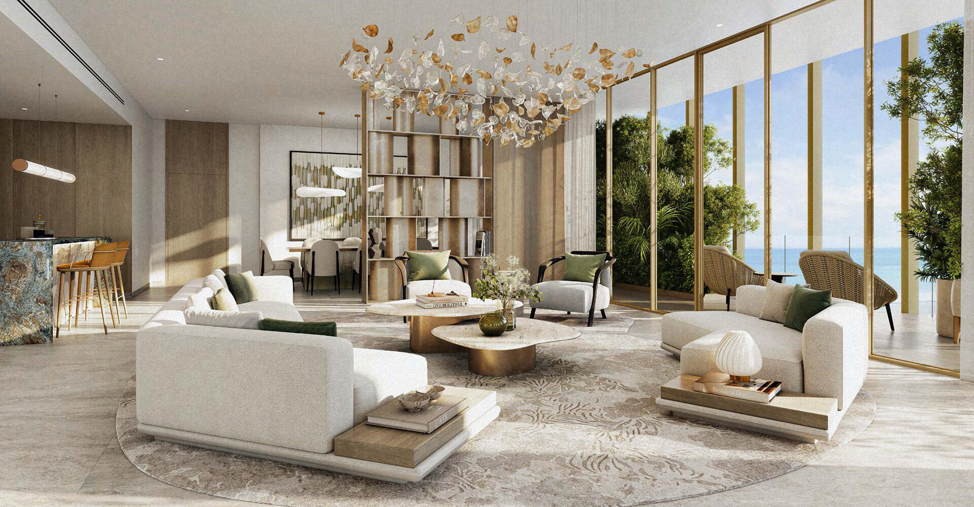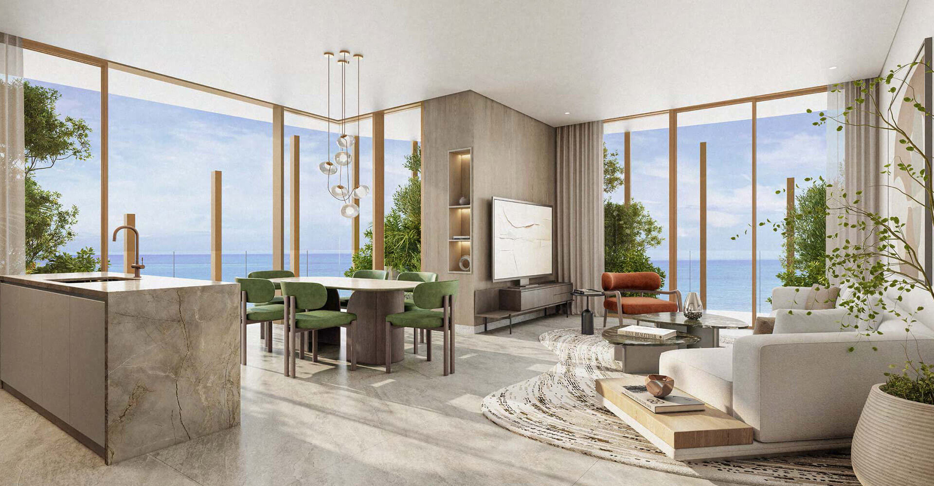 The exterior has been sculpted mindfully with contemporary style, layered detailing, a striking glass facade, and well-framed homes with spacious balconies. Positioned high above on the coast, the surroundings are blessed with greenery, water gardens, a podium beach lagoon, walkable, relaxation, and meet & greet casual spaces bring nature and a sense of connection with people and blooming nature. Many indoor spaces are also curated with smart and well-equipped fitness centres, sports facilities, and family areas, and entertainment sources are embedded within this prestigious and exquisite tower.