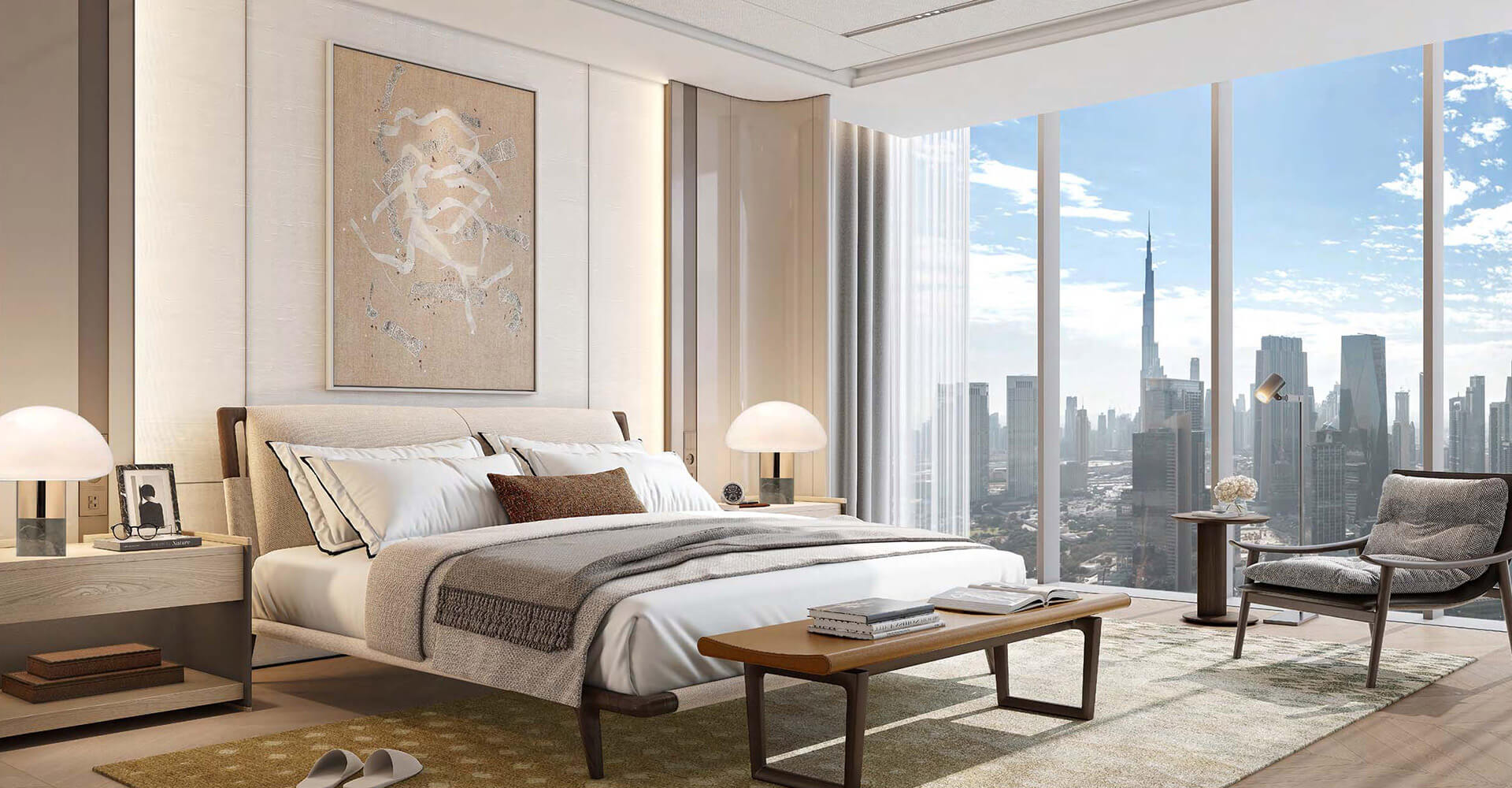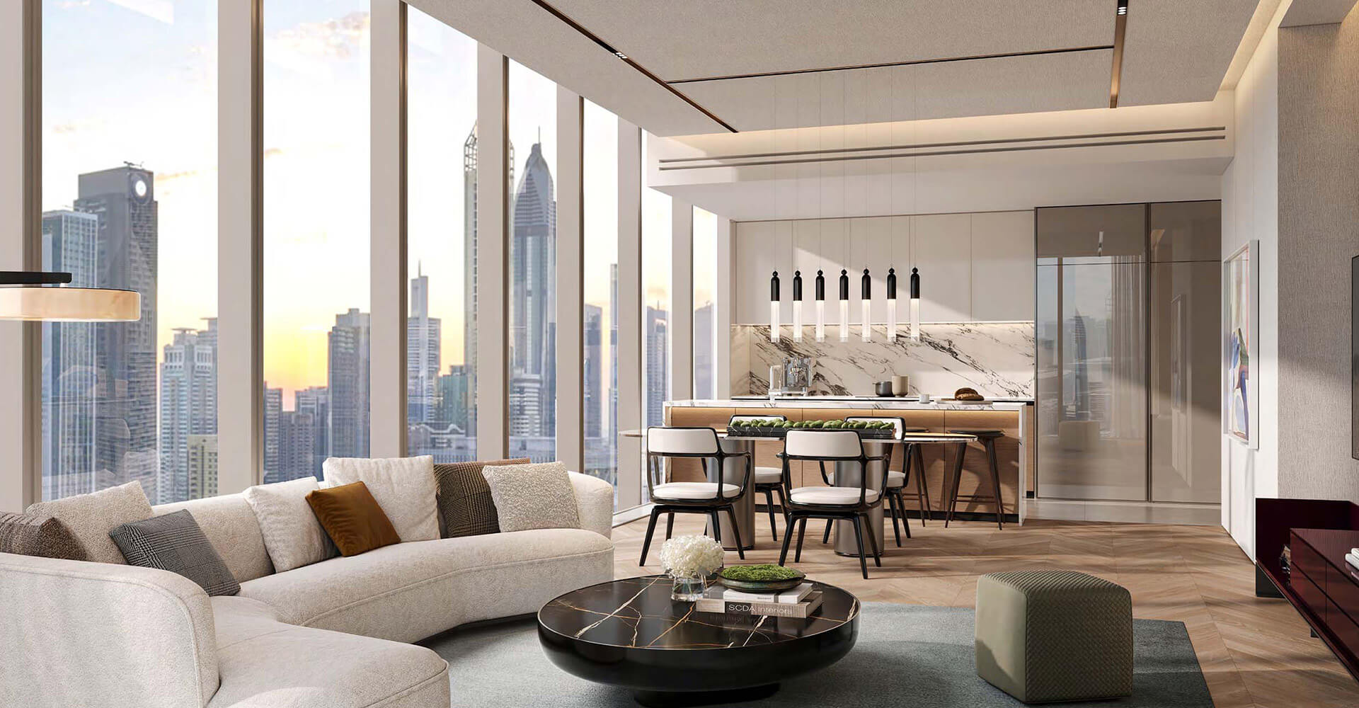 The architecture of Jumeirah Residences Emirates Towers by Meraas is modern in style with an emphasis on vertical lines and glass facades. The interior design of the apartments features high ceilings, panoramic windows and an open floor plan. Natural stone and wood are used in the finishes. The kitchens are equipped with built-in appliances and a well-designed storage system.