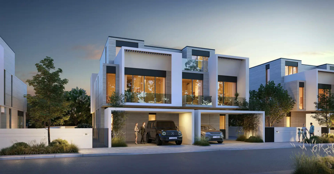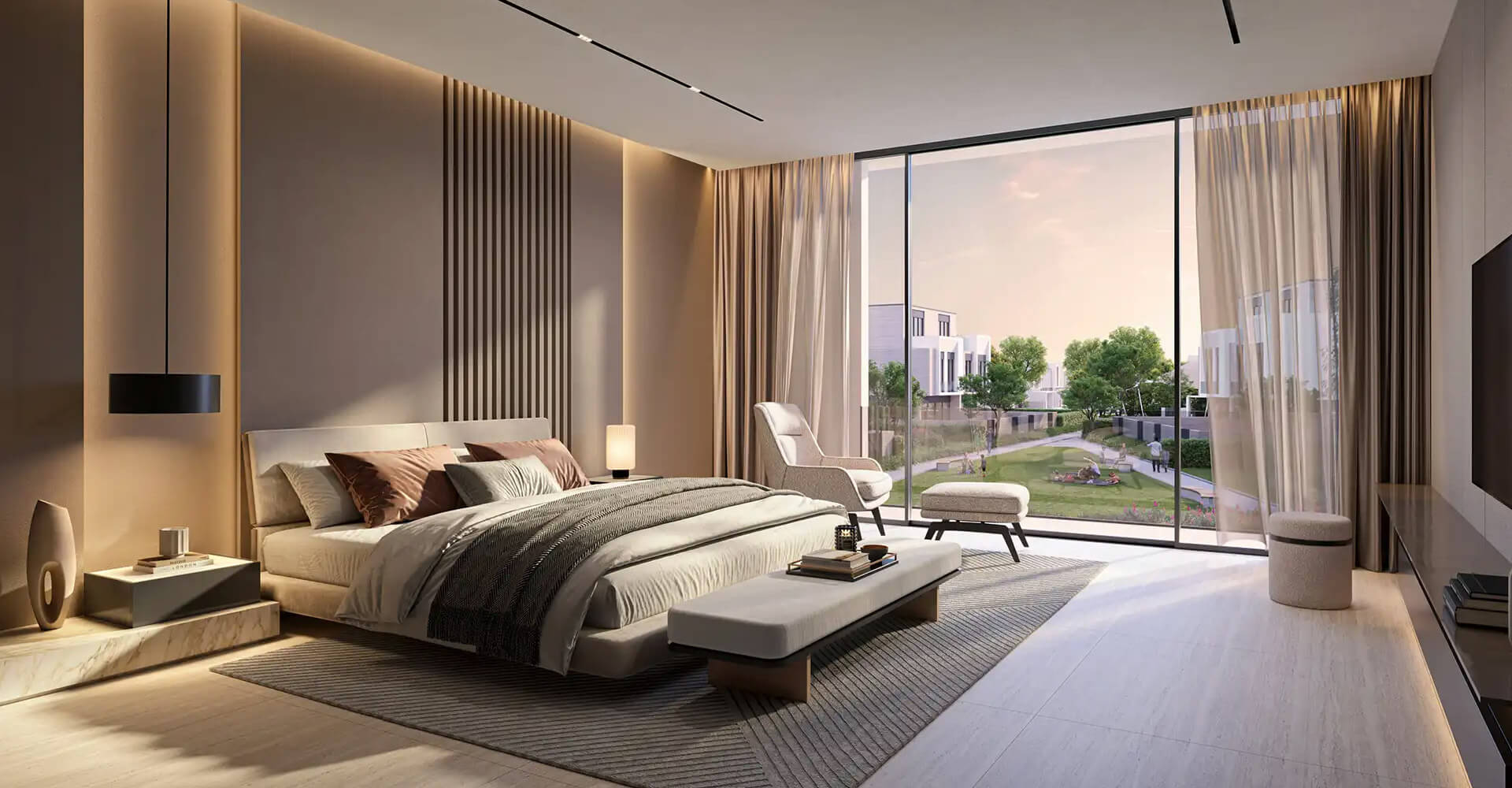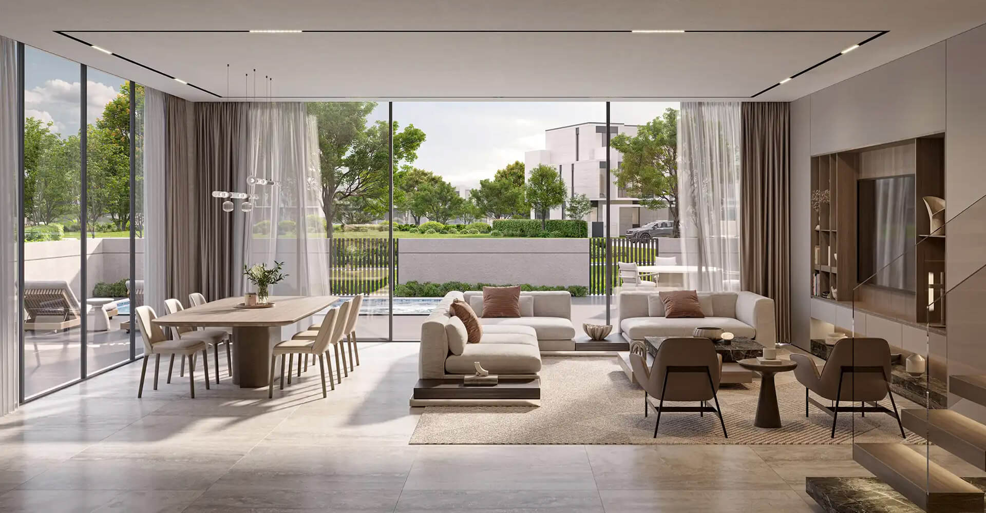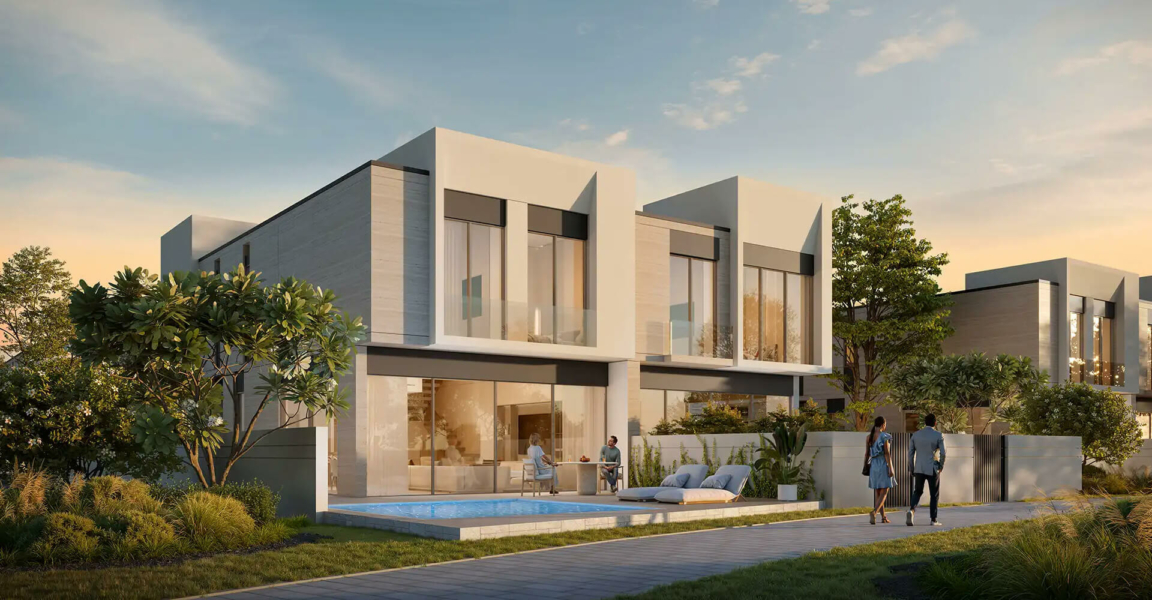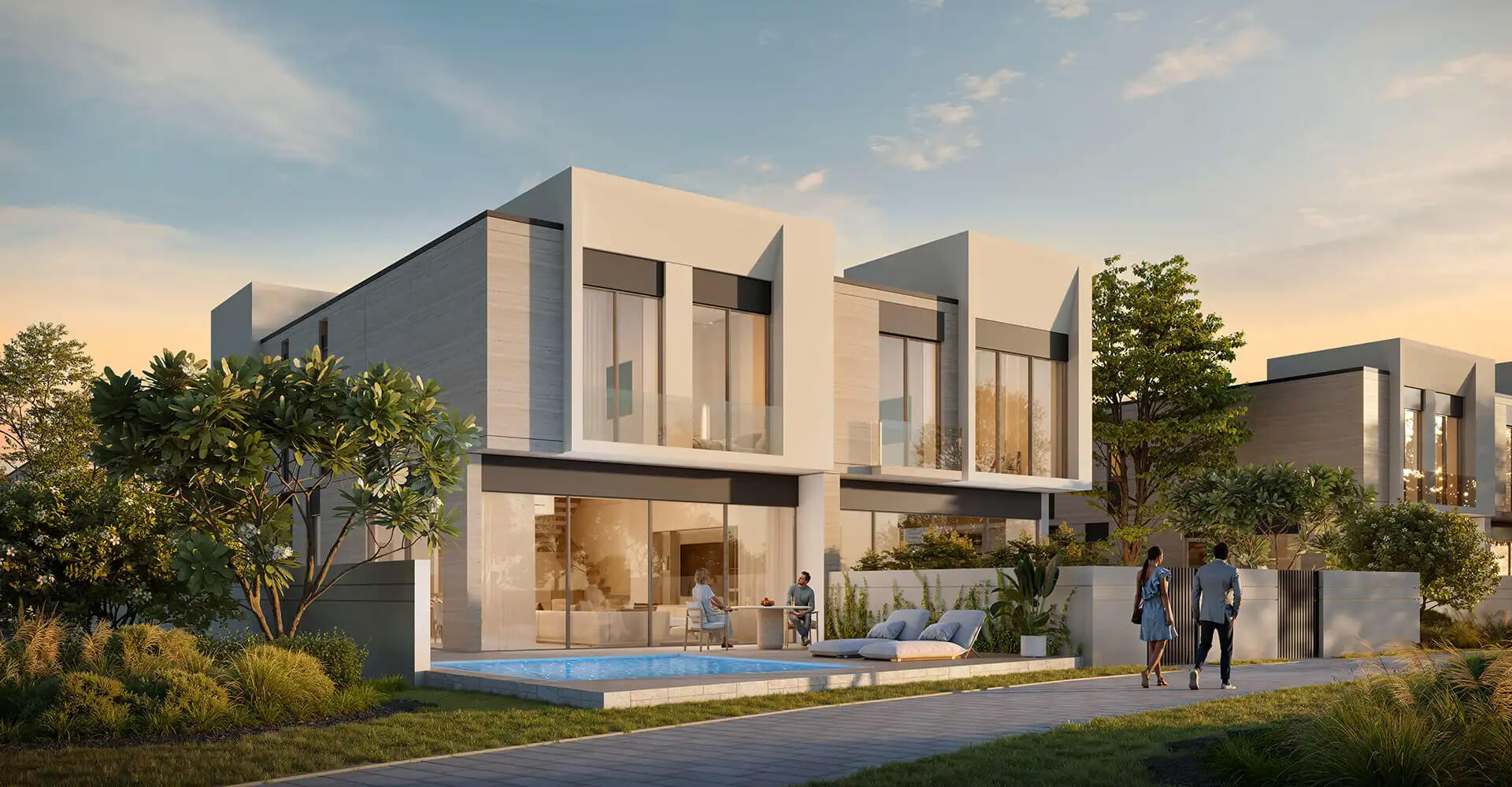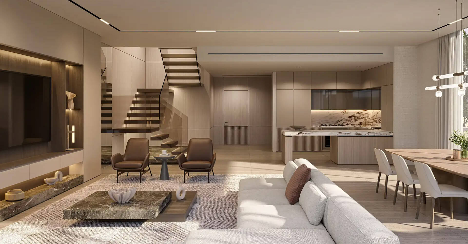 The villas at DarGlobal Villas come in two configurations, with 4 and 5 bedrooms. They feature 2 and 3 floors accordingly. The buildings are designed in a modern minimalist style with an emphasis on clear geometric shapes, panoramic glazing and a contrasting combination of textures. The rooms are flooded with sunlight due to large windows and glass enclosure on the balconies. The 4-bedroom villas at DG Villas by DarGlobal are available in sizes from 2,899 sqft (269 m²), and 5-bedroom villas start from 4,011 sqft (373 m²). Marble and porcelain tiles are used for designing the interiors. Living rooms are finished in a light color scheme with accent walls and elegant decorative elements. Kitchens feature quartz countertops and built-in appliances, including gas stoves and refrigerators. Bathrooms feature natural stone textures and Kohler plumbing fixtures. The backyard contains a pool and relaxation area with sun loungers.