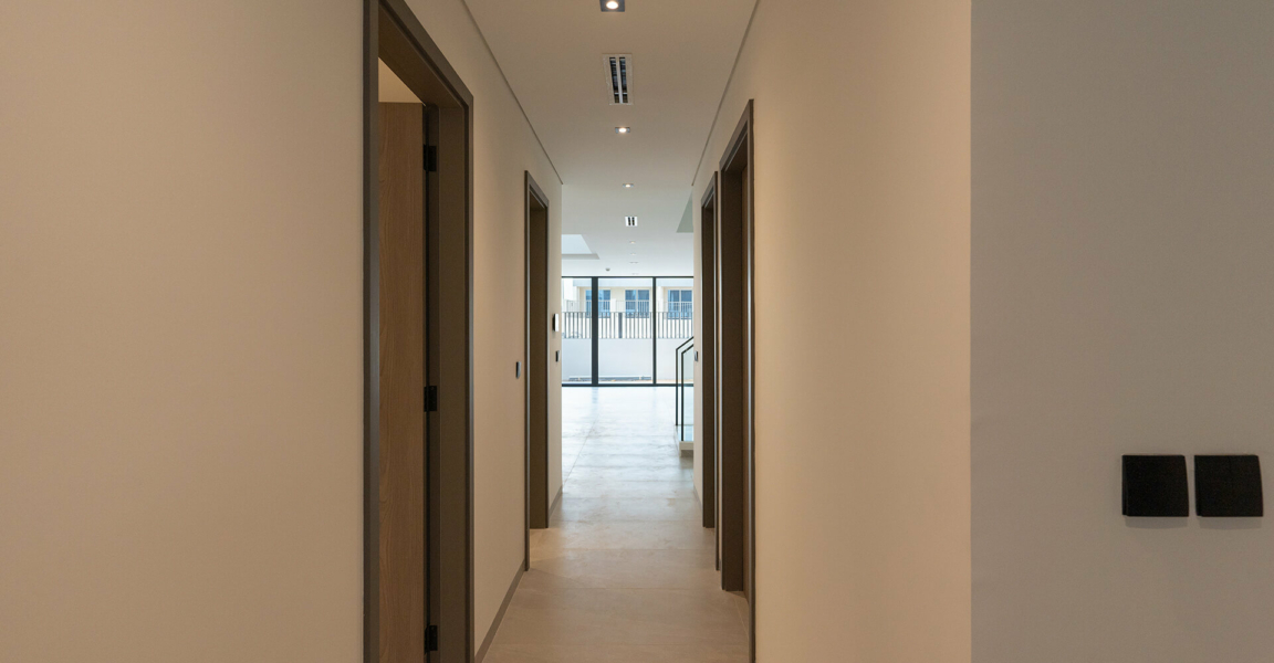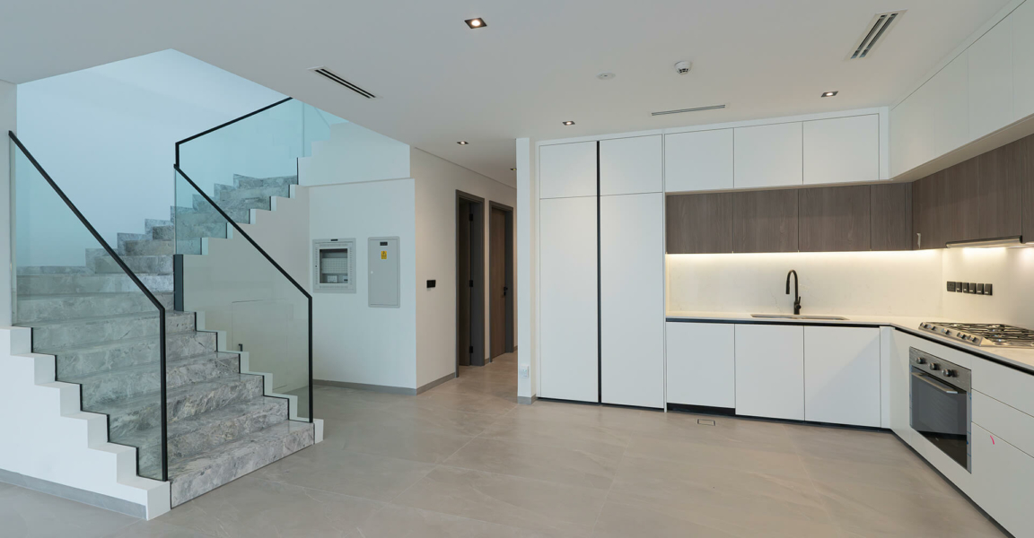 Zimaya Villas – 4 BR + Guestroom Room Luxurious Designer Villas in Al Furjan. Designed by SCI interior. Located in Al Furjan, next to Ibn Batuta Mall. One of the closest communities to SZR with metro connectivity and around 10 minutes to Dubai Marina and JBR. Design Studio. Ground floor comes with an Elegant dining and living room of this homely residence making it a modern style living. Spacious and modern kitchen, with fully equipped kitchen appliances from Teka. The Townhouse is equipped with Voice Controllable Smart Home Automation System and a smart lock entry door.